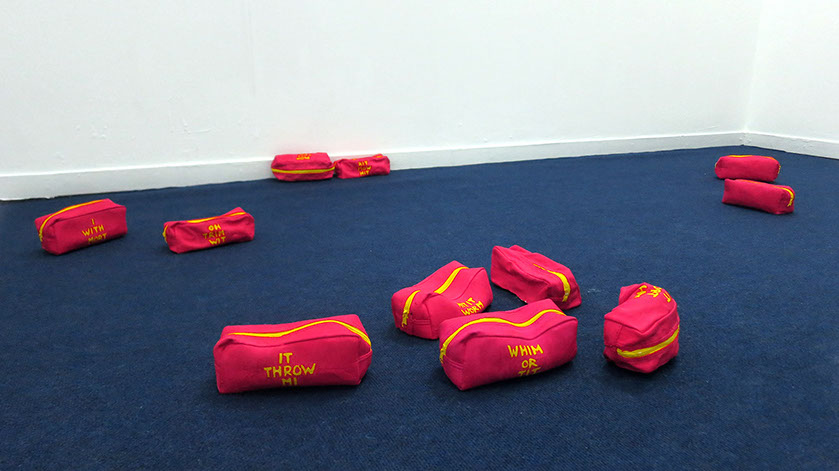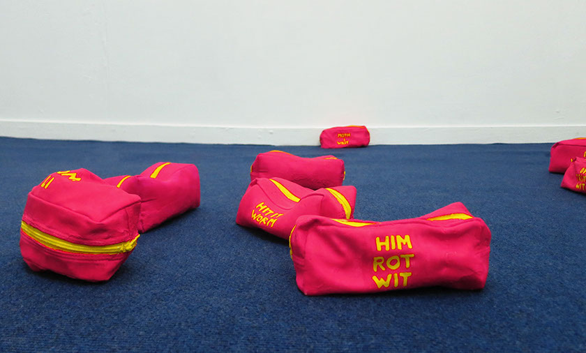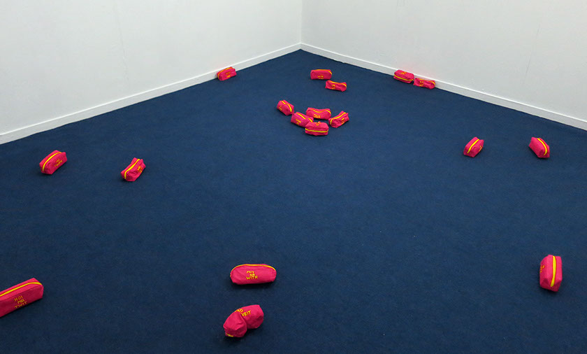 IMWORTHIT (2015) Hand painted plaster, carpet Multiple versions of the same object were cast from a single cosmetic bag found in a beauty magazine. Cast in plaster, each object was painted to imitate the original. Letters of the original text were rearranged to produce new slogans for each object.