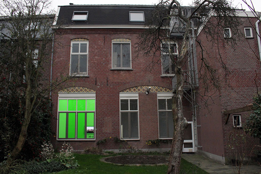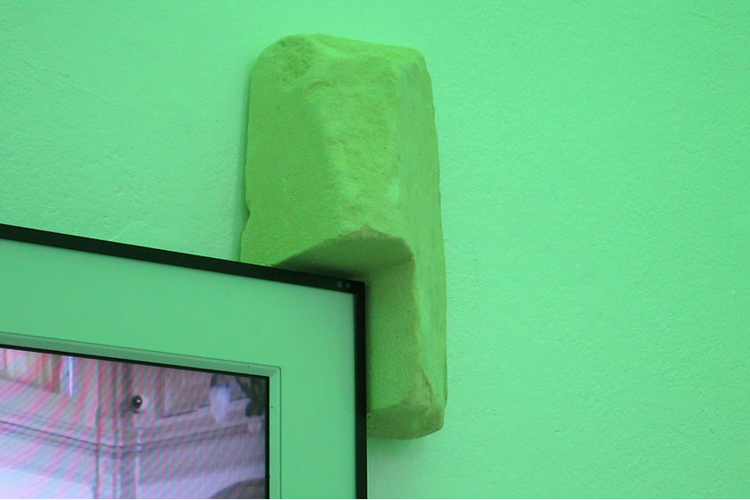 Mutter II (2016) Kunstpodium T, Tilburg (NL) Multimedia Installation; single channel video, LCD screen, green lighting, limestone, Kunstpodium T, Tilburg Mutter (part 2) is a multimedia installation saturated in green light: a true tale of deceit set up in a space of fiction. As an extension of the filmed performance intervention, a room in the building of the Kunstpodium T was transformed in a sub-reality where pieces of limestone were sculpted to the video monitor and English subtitles were projected on the walls of this electric green space.