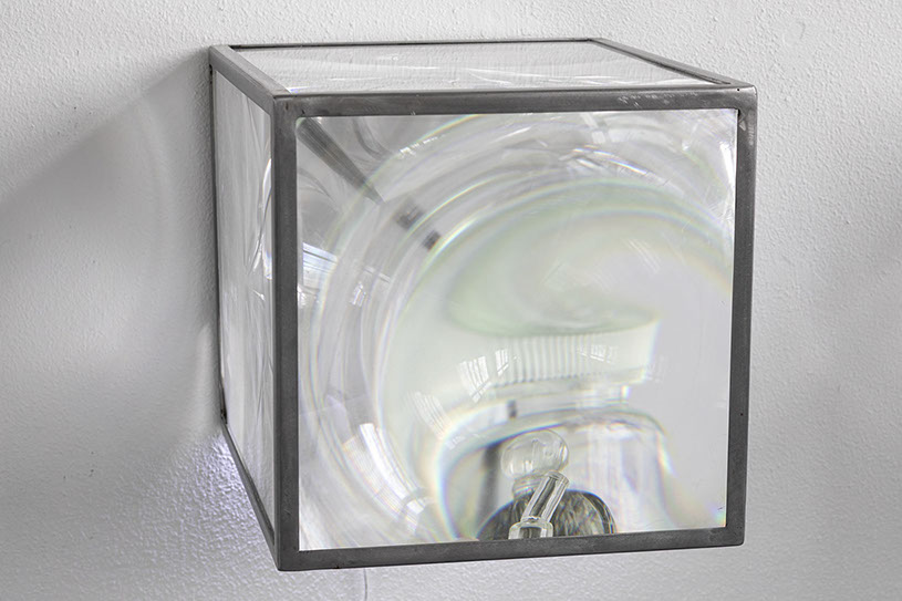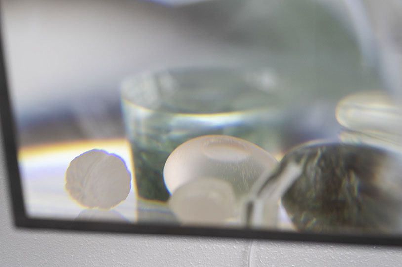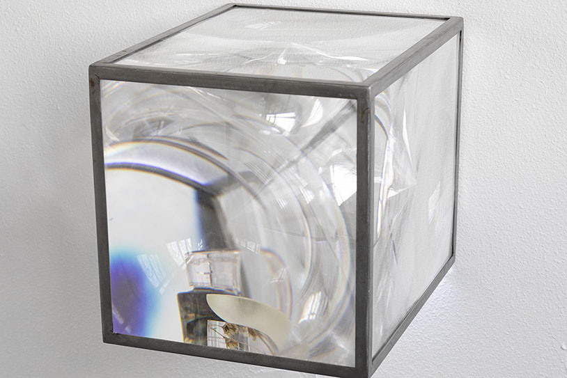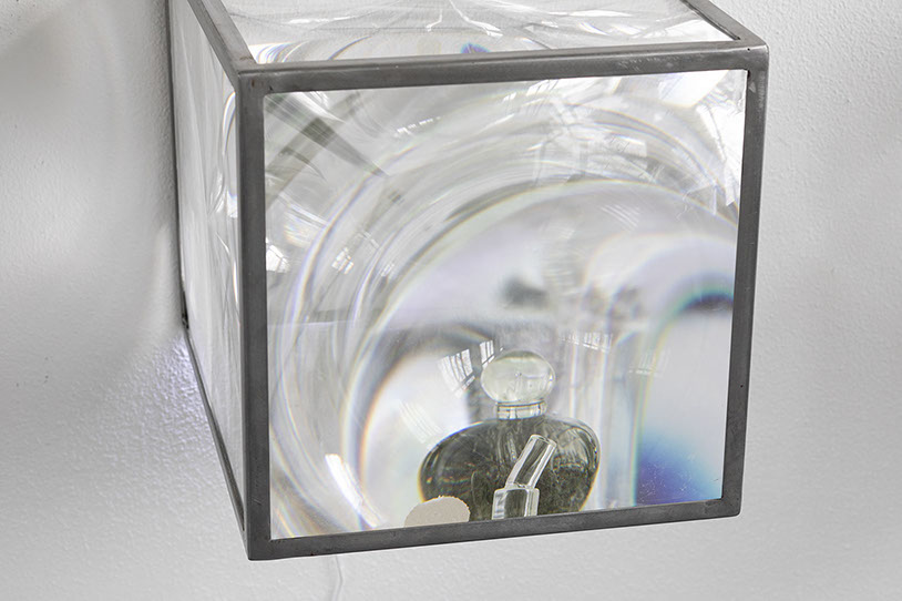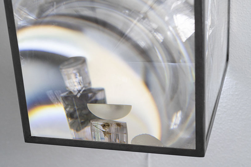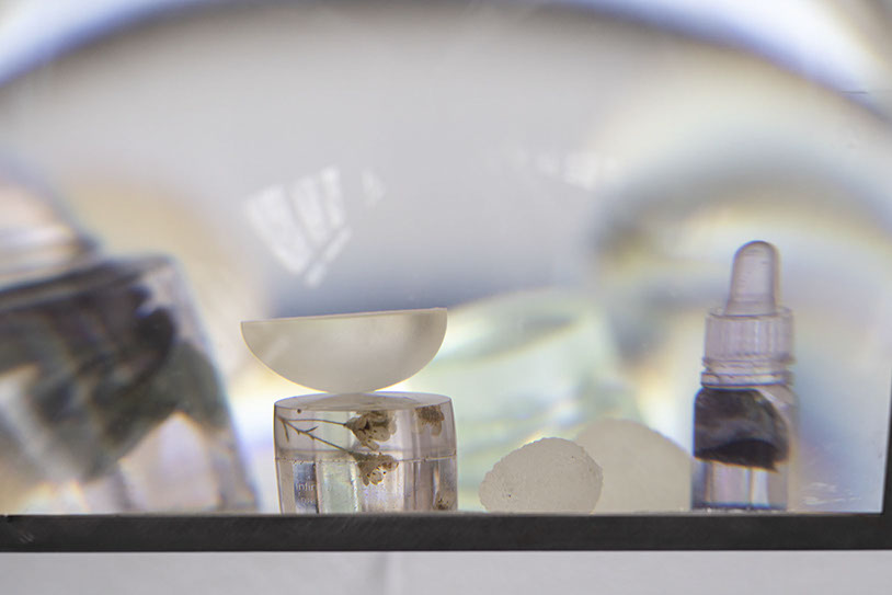 scotoma saguaro (2020) resin, dried flowers, steel, magnification lenses, 40 x 32 x 32 cm scatoma saguaro is a set of two wall mounted vitrines lined with magnification lenses. Fragments of objects taken from my daily surroundings such as face-creams, perfume and vitamin bottles, walnuts, eggs and lychees, were cast in resin and dried flowers. Excerpt by Alina Lupu: "The vitrines induced blind spots, making objects not always visible from every angle. Based on your height, movement and positioning, the vitrines could play like a personal film, a nod to the early beginnings of cinema, projection and magic lanterns, a mental experience of enigmatic images. From a certain angle, putting one’s head in between the vitrines, the outside world flipped upside down." ------------------------- two sets of space attached to a wall whose internal measurements are larger than their shells one could tell by the encased objects1 that kept swelling, kept swirling swaying with the slightest sway spontaneous! sci-fi in the making of elastic images sometimes with outlines made from rainbows 1 Fragments of objects taken from my daily surroundings such as face-creams, perfume and vitamin bottles, walnuts, eggs and lychees, were recast in epoxy and dried flowers. -------------------------- The production of this work was made possible by Mondriaan Fonds as part of Prospects and Concepts at Art Rotterdam 2020, curated by Johan Gustavsson. Images by Ayako Nishibori for (2021) a group exhibition initiated by Mitch Thar softdelay.nl
