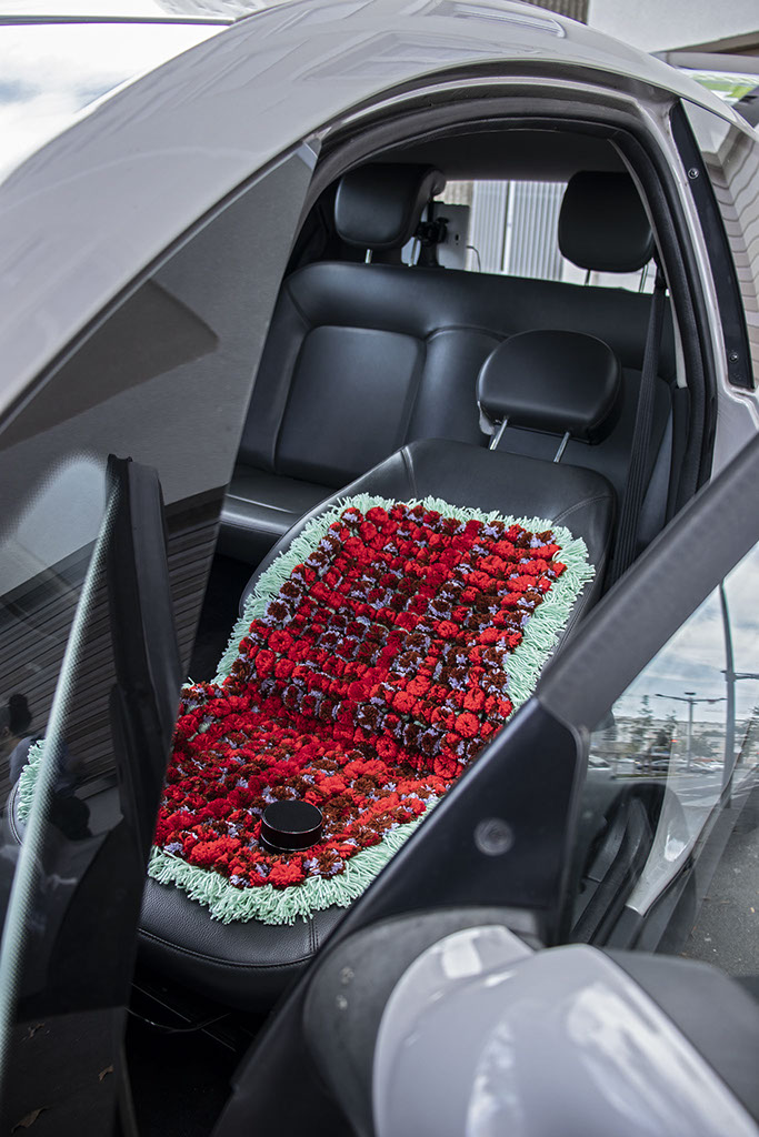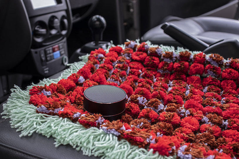 Vasilisa (2019) woolen weave, wifi-speaker with looped sound piece (8' 7") Innate Fuel was an off-site group exhibition that took place in a rental car, curated by Antonin Giroud-Delorme for the 15th Lyon Biennale (FR). My contribution consisted of a woolen seat cover woven on a custom-built loom and a sound piece in which the lyrics of popular RnB tracks were deranged and re-arranged to form new sounds. Contributing artists: Andrea Belosi & Bin Koh, Damien Fragnon, Antonin Giroud-Delorme, Ana Navas, Alice Dos Reis, Caroline Saves, Michelle Son, Ellen Vartun. Full documentation HERE
