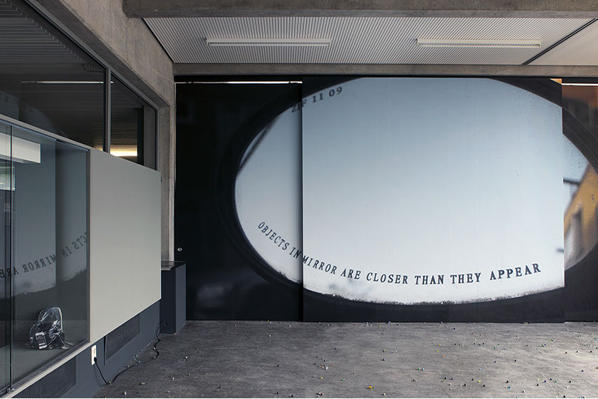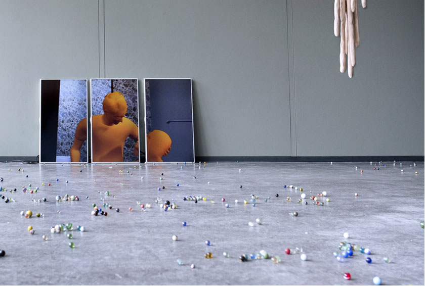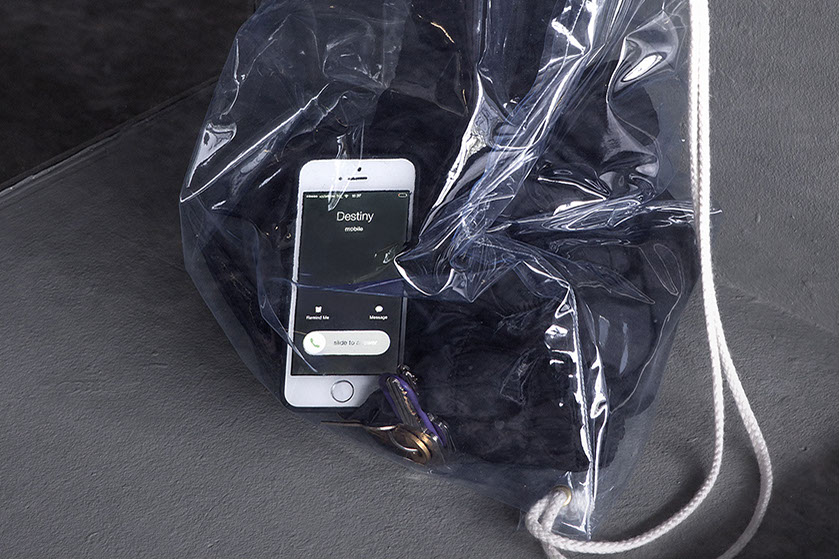ZPF 11 09 (2016) Rietveld Academy, Amsterdam (NL) Single channel video; display screens; ink-jet print; marbles; programmed calls from Destiny; transparent backpack, keys and jacket